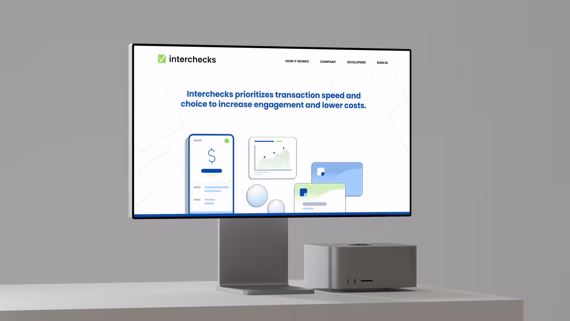 We partnered with Interchecks to refresh the look and feel of the Interchecks brand, and apply this new look to their website. We developed a new identity with a visual throughline of graphics that symbolize the movement of money at speed and at scale. Our work includes strategic consulting on user experience design, full site UI design, and a variety of custom illustrations and animated graphics used throughout the designs.